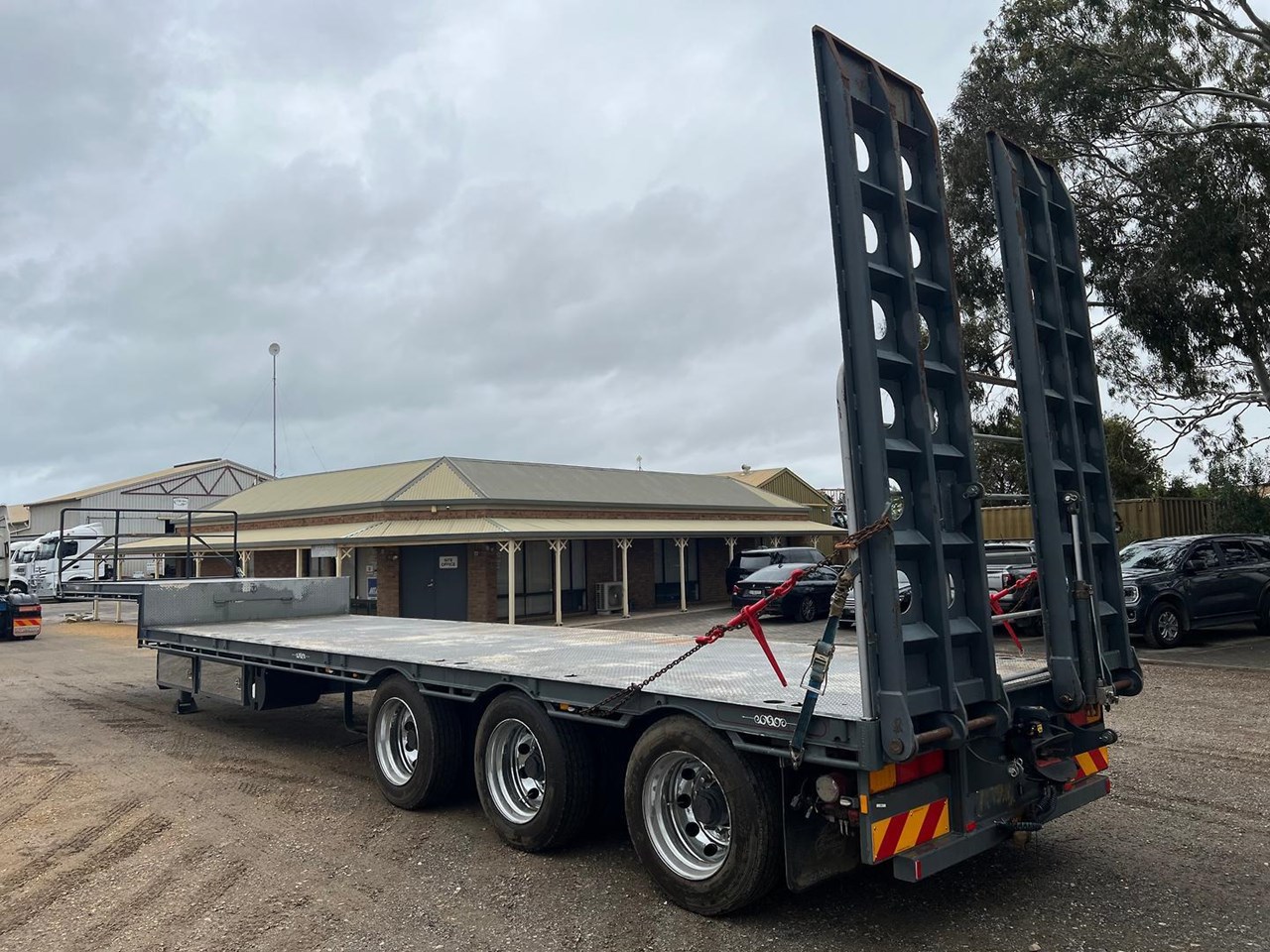 44'6" Long, Container Pins, Road Train Rated with Ringfeder & Air & Electrics to Rear, Electric/Hydraulic 3m Ramps, York Axles on Spring Suspension, Jost Landing Legs, 10 Stud Chrome Wheels, 255/70R22.5 Tyres, 1020mm Deck Height, 2 x LH Side Toolboxes, Water Tank, Front & Rear Loading Racks, Spare & 2 x Carrier, Very Tidy Trailer with Road Train Rating.