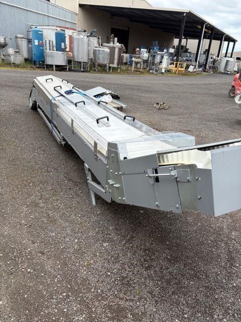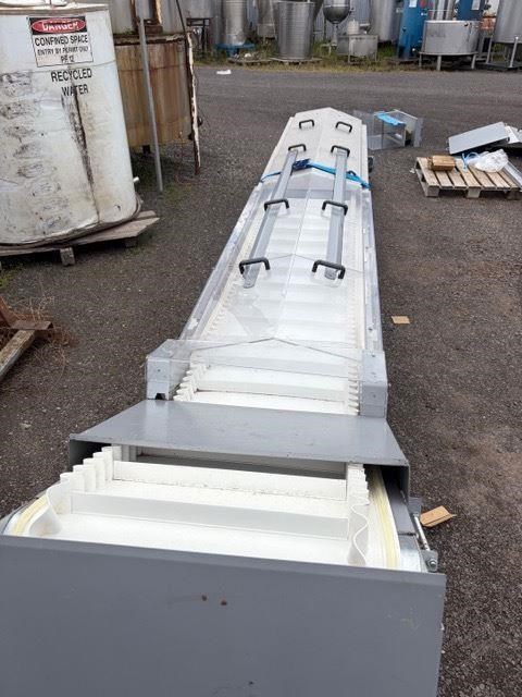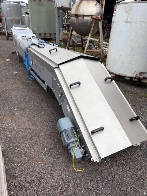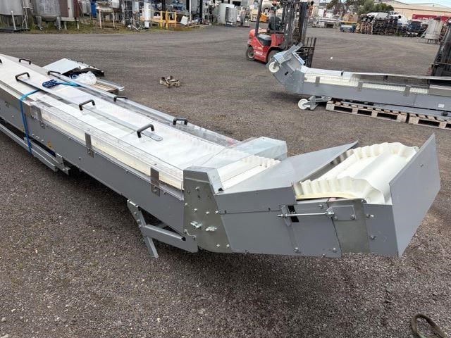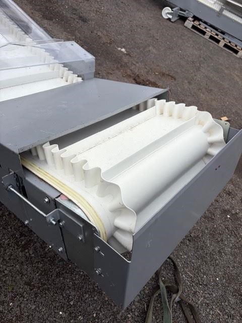 Food Grade Cleated Elevating Conveyor. Specificatios: Discharge height 3.2m (adjustable) Belt width 500mm Cleat Height 40mm 800mm long flat section at the bottom 1200mm flat section at the top The incline is 4200mm long SEW Geared Motor drive 0.55kw, 415V at 50rpm YOM: 2020 Made in Belgium. This unit has never been used. Comes with legs and belt covers.