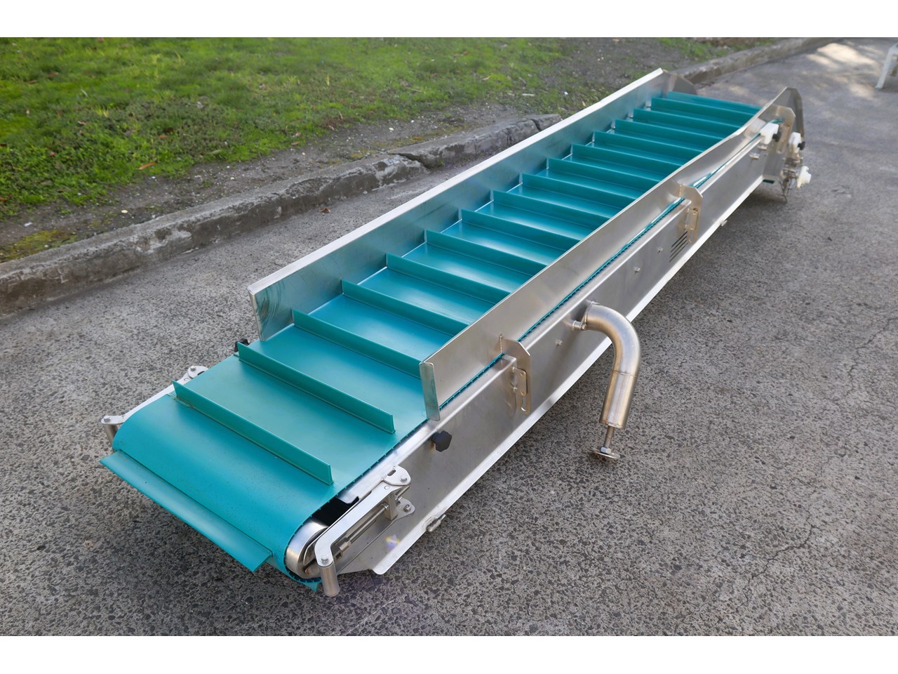 This conveyor is in great condition. Designed to move materials or products at an upward angle, bridging differences in elevation. They are commonly used in various industries.